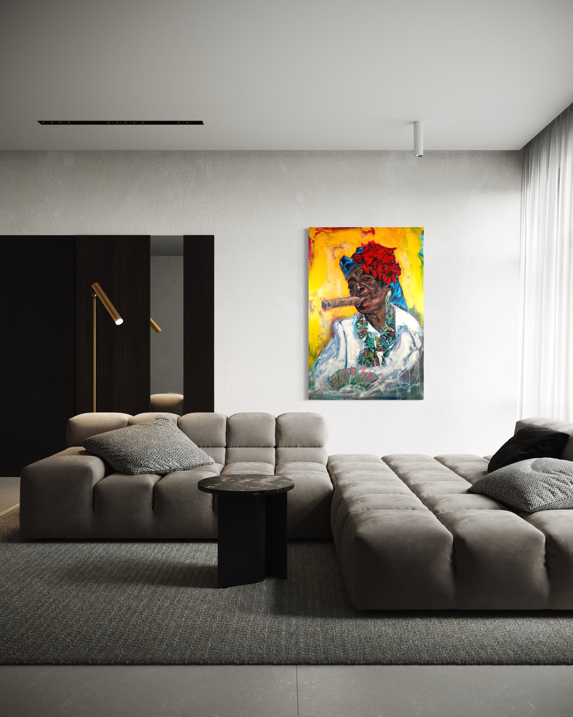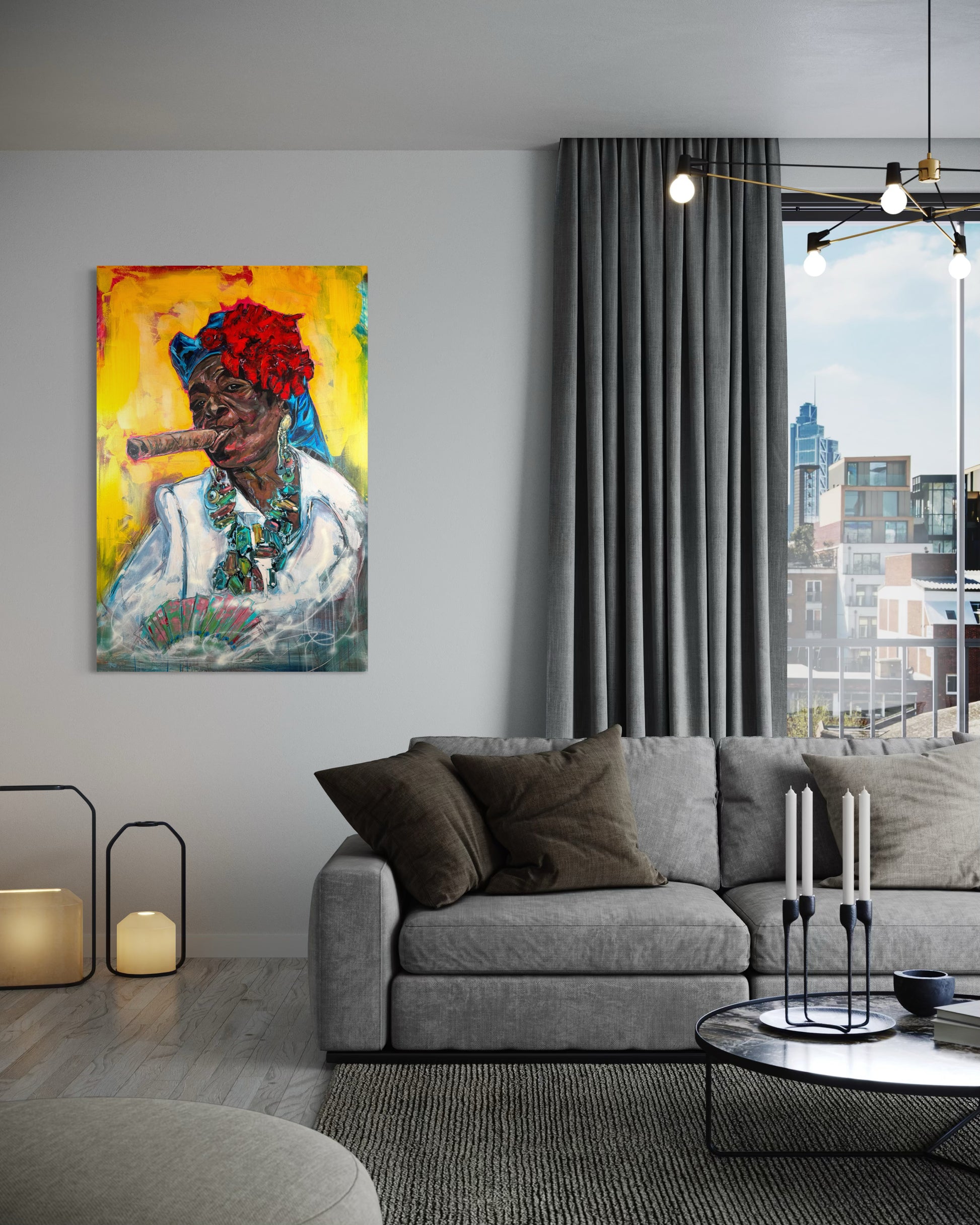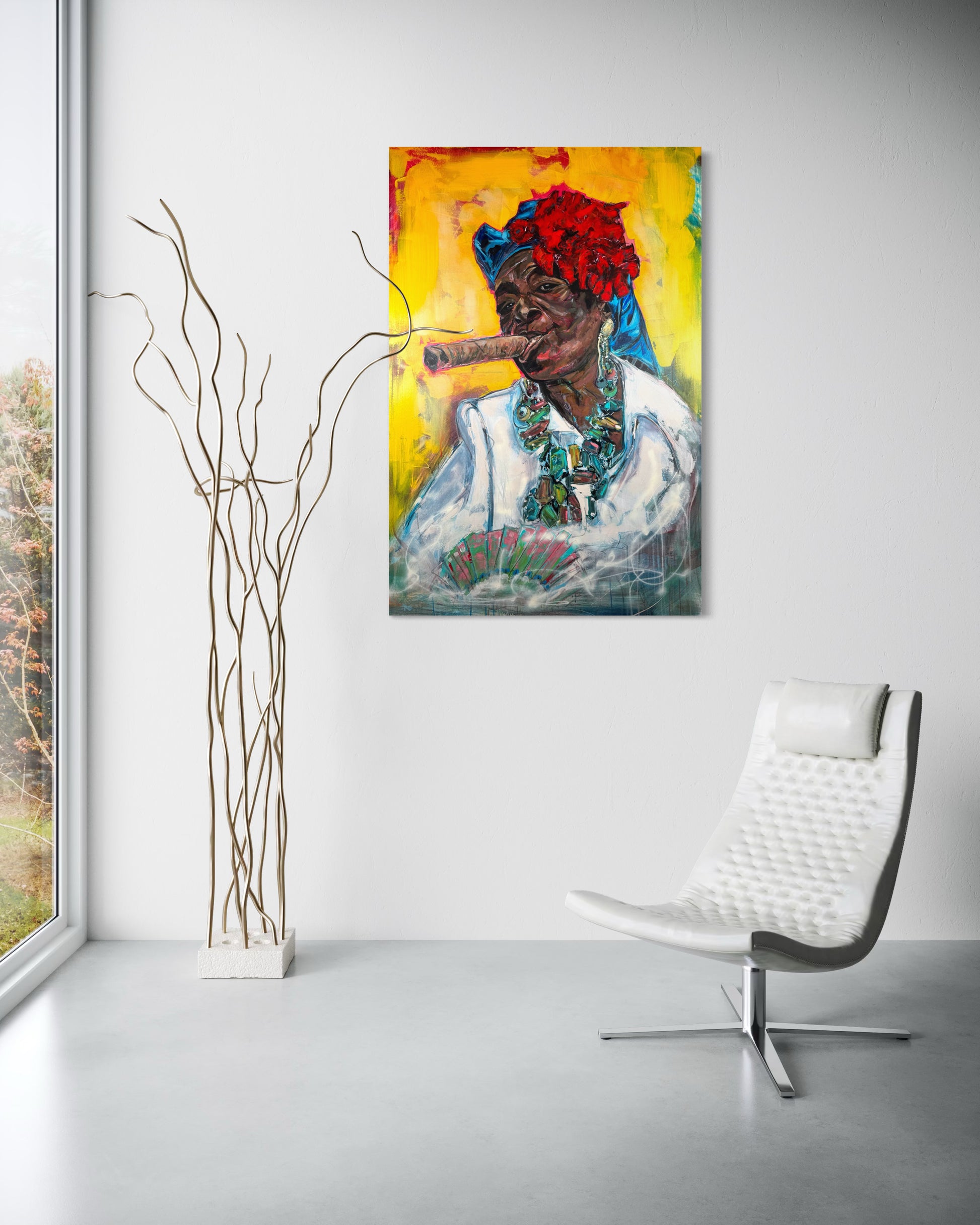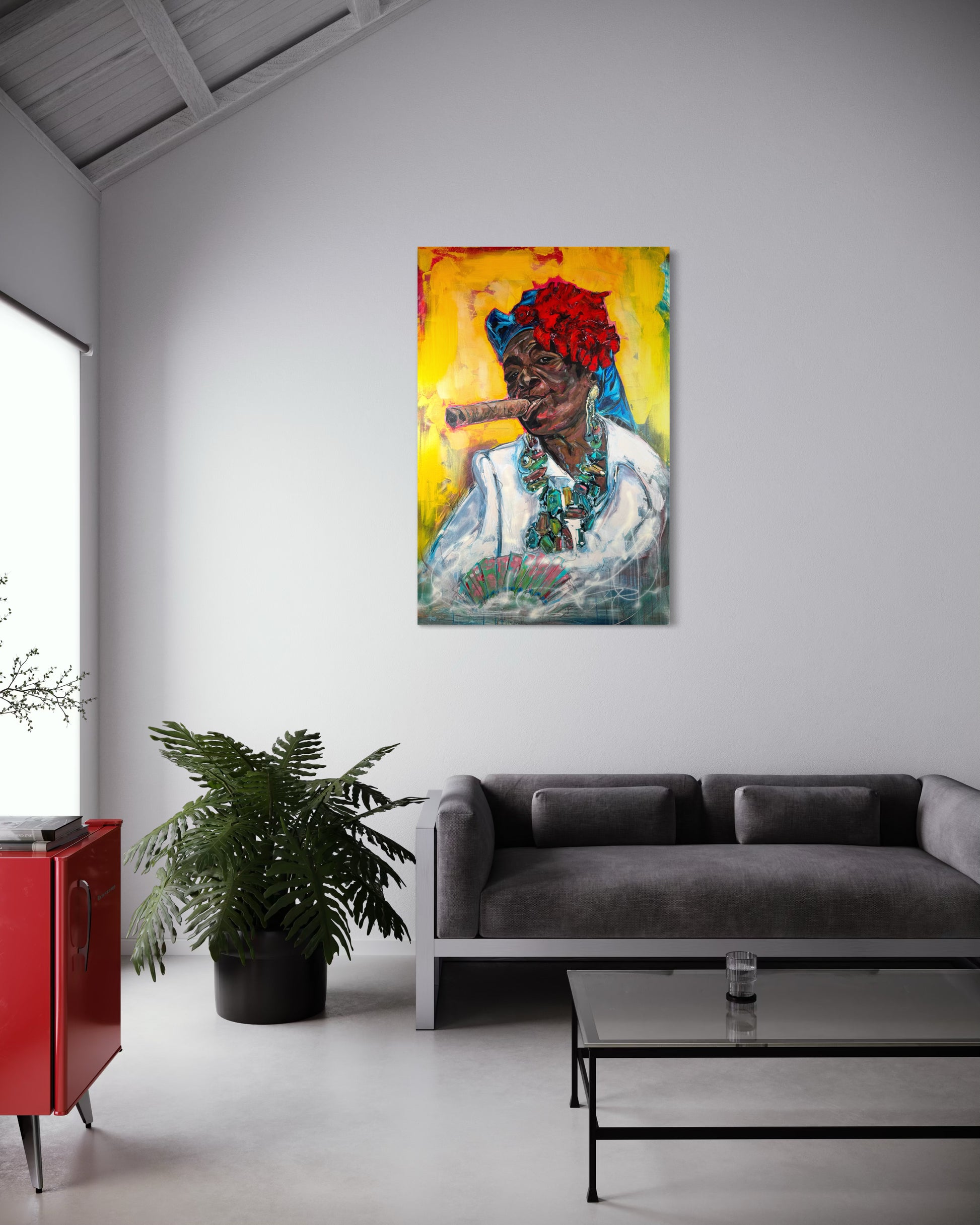 Experience the vibrant energy of our Cuban Woman with Cigar portrait, a stunning original painting portrait by Gkotsi Art. This captivating piece is sure to add a touch of elegance and cultural flair to any space.